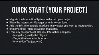 This system provides a single, central way to trigger interactions from anywhere in your project. Interactions can be automatic (overlap based) or manual (input driven), and can be called from any Blueprint without casting to characters, game modes, or other project-specific classes.