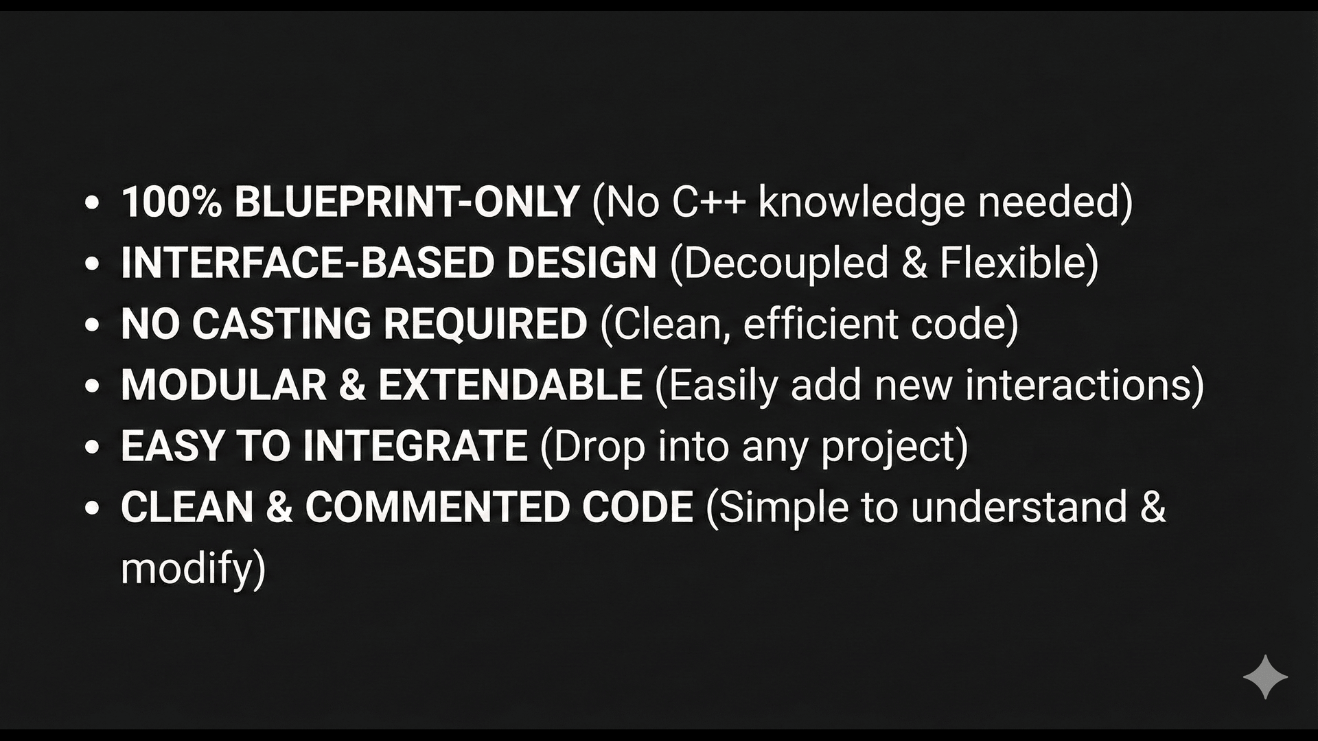 • Blueprint-only, no plugins or C++